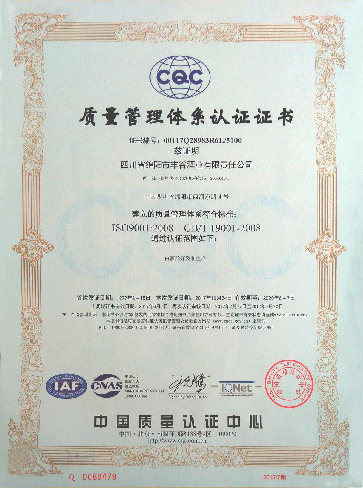質(zhì)量管理體系認(rèn)證證書(首次發(fā)證日期:1999年2月15日,認(rèn)證范圍:白酒的開發(fā)和生產(chǎn))---中、英文版(證書編號(hào):00117Q28983R6L/5100,ISO9001:2008,GB/T19001-2008)