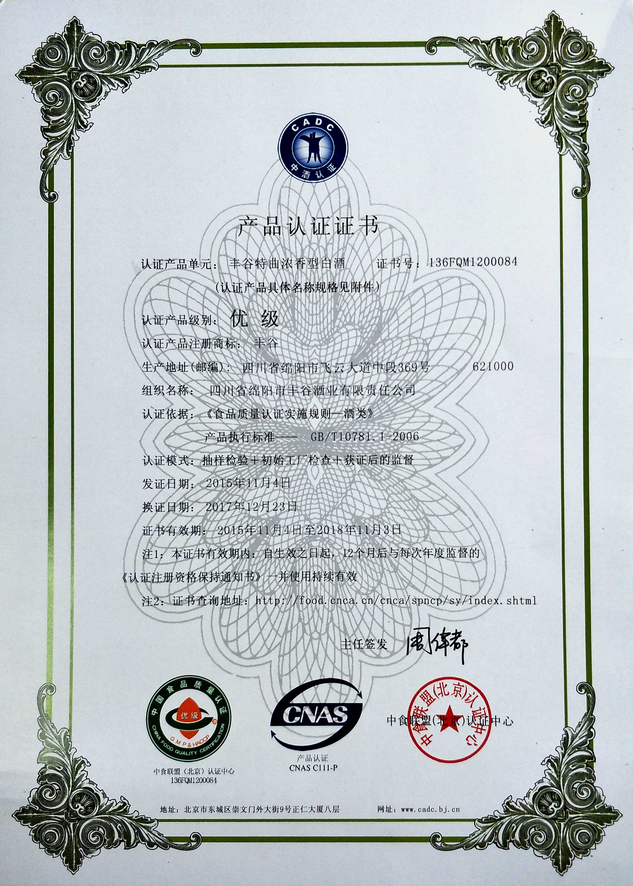 產(chǎn)品認(rèn)證證書(豐谷牌濃香型白酒)---優(yōu)級(jí)--證書號(hào):136FQM1200084